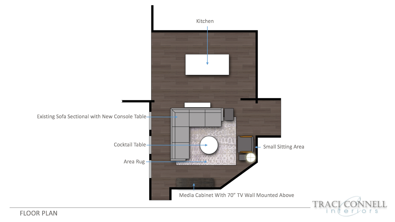 We gather all the information from YOU about your space! The dimensions will allow us to draft the floor plan. This amazing client recently moved into their newly built home and were looking for a perfect plan for their family room.