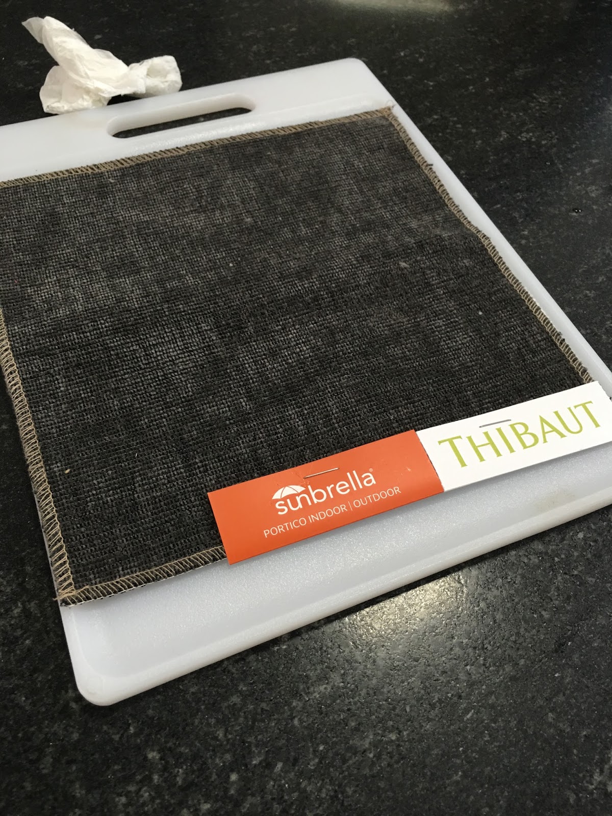 This gray Sunbrella fabric had a bleach pen taken to it, and after a wipe off — nothing was damaged!