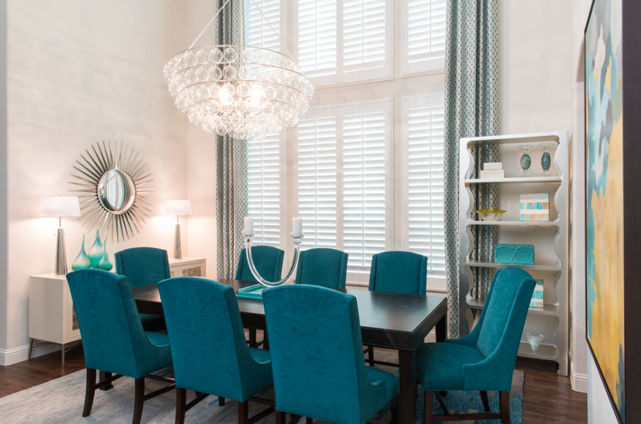 Many people don’t know the “etiquette” when it comes to shuttered windows and drapes. Should you, could you, add curtains? The answer is yes. You CAN, but you also don’t have to. When we add drapes to shuttered windows we usually create a one-width panel and pull them to either side, not to block more of the window than necessary.