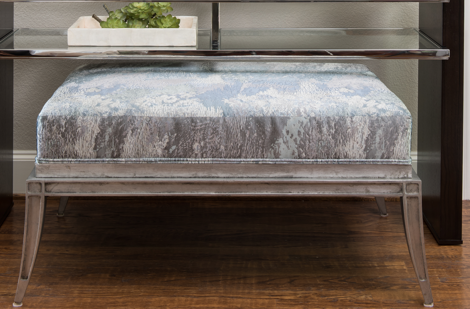 Our favorite surprise of all… a bench nestled into the console table, for cuteness as well as purposeful.