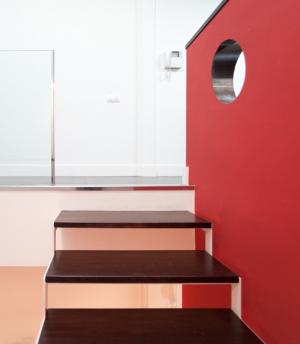 A closed staircase. This creates choppiness in a space that may be needed to delineate areas. By the use of a color change on the staircase, it adds to the modern black and white feel.