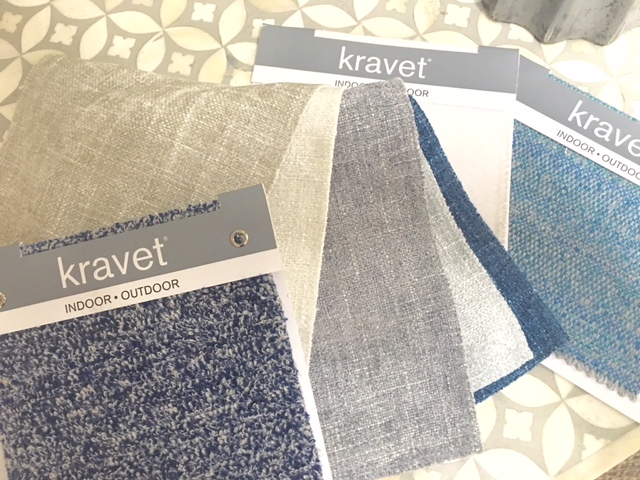 Our Kravet rep was in our office with these BEAUTIFUL fabrics. Not only were they beautiful, but listen to this — These indoor fabrics had over 50,000 double rubs (fancy way of saying they will withstand … a lot) , but they are so soft and pretty and when used INDOORS make for the perfect combo of glamorous and durable.