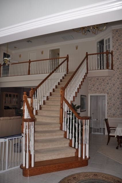 Finishing touch on Mrs.White Walls iron baluster project I showed you last week. The wood banister was stained dark and the project is complete… take a look-